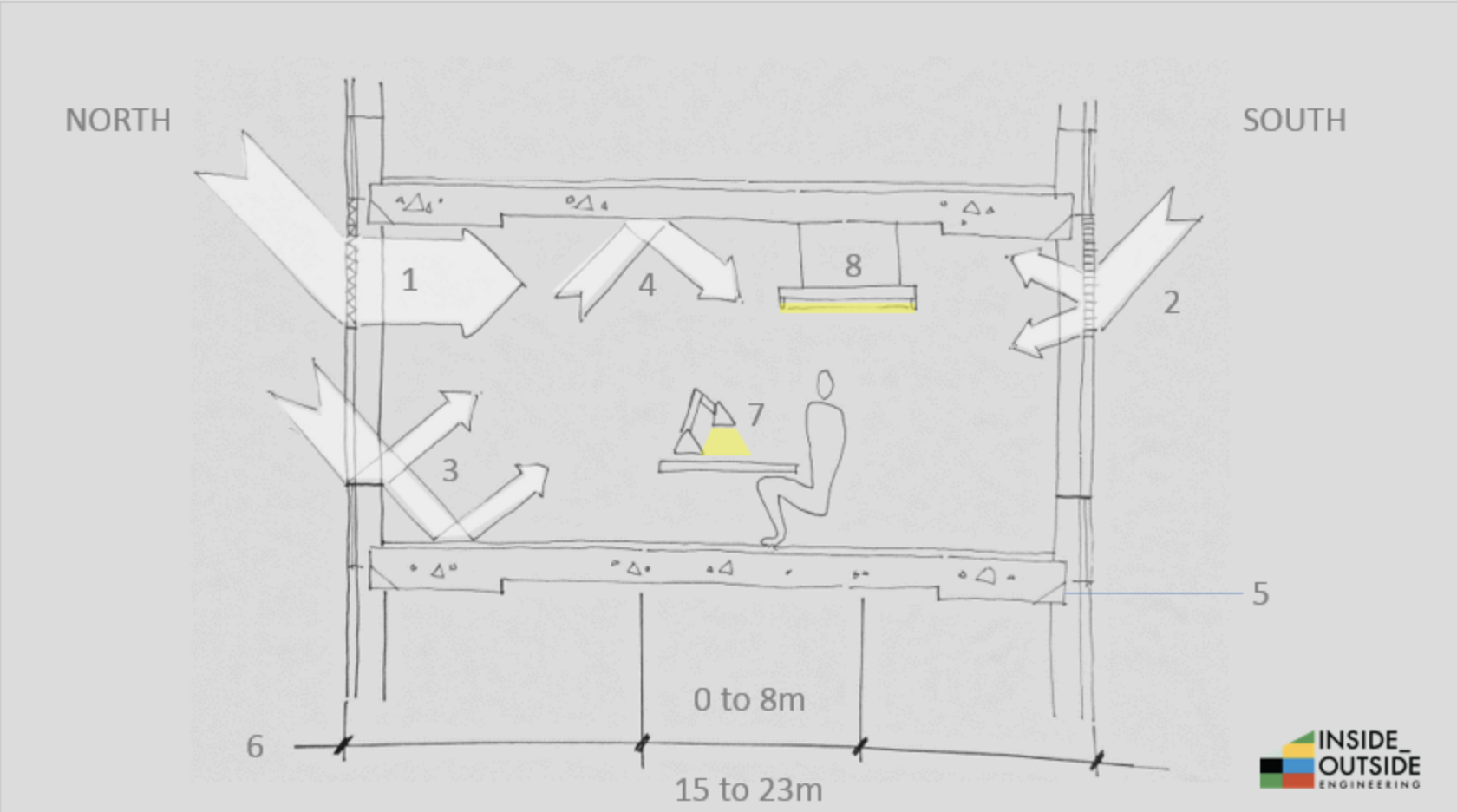 6 Floor plate is 15-23m wide; good daylighting & views out achievable upto 7.5m, hence there is a sub-optimal zone of 0-8m in the centre of the plate. Use this for circulation or secondary spaces.